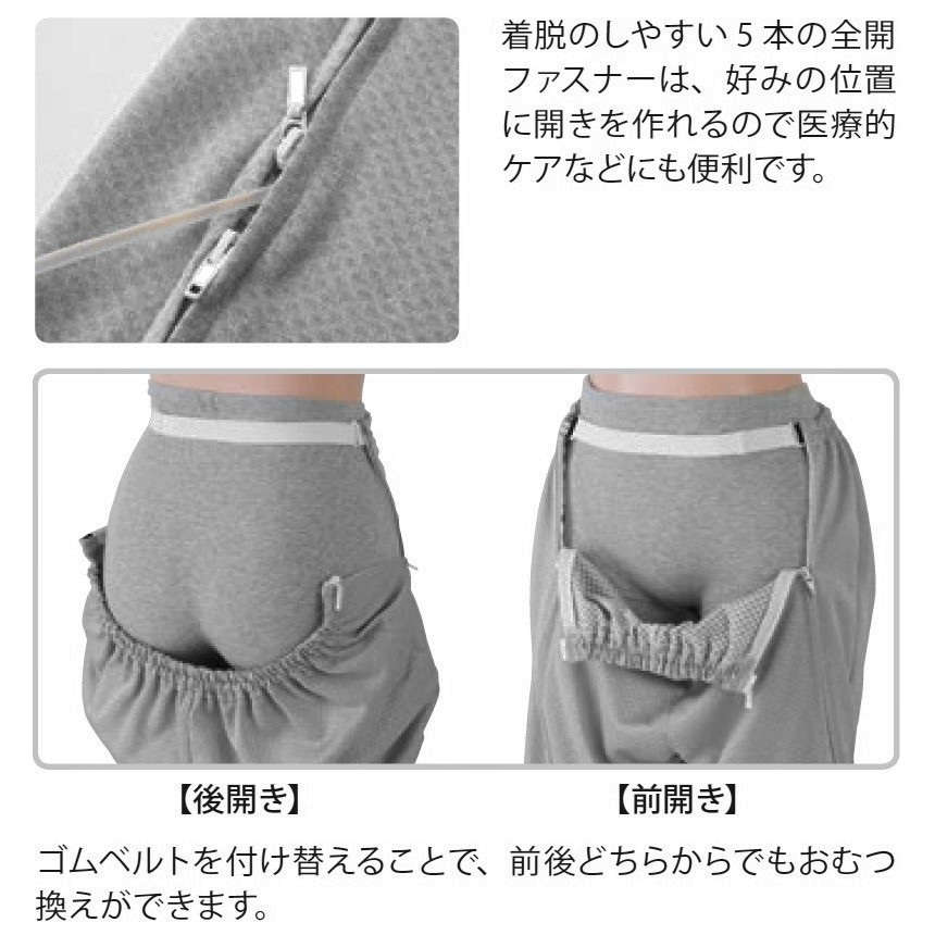 ☆着脱のしやすい5本の全開ファスナーは、好みの位置で開きを作れるので医療的ケアなどにも便利です。